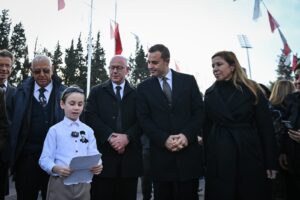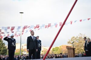 Atatürk Anıtı’na çelenklerin sunulmasıyla başlayan törende, saatler 09.05’i gösterdiğinde 2 dakikalık saygı duruşunda bulunuldu. İstiklal Marşı’nın okunmasıyla bayraklar yarıya indirildi.