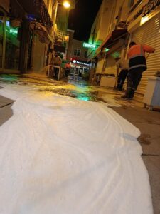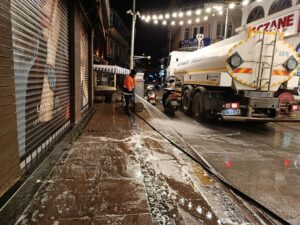 bölgelerde kıyılar dip bucak temizlenirken, Talatpaşa Caddesi köpüklü sularla yıkandı.