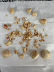 Büyükşehir Belediyesi veteriner hekimleri tarafından tedavi altına alınan Gofret’in idrarını yapamadığı tespit edildi. Veteriner hekimlerce idrar kesesinde taş olduğu ve taşların idrar kanalını tıkadığı anlaşılan Gofret, ciddi bir operasyonla hayata döndürüldü. Balıkesirde bir ilk olarak gerçekleştirilen operasyon sonucu Gofret’in idrar kesesinden 171 gram ağırlığında irili ufaklı 147 adet taş çıkarıldı.
