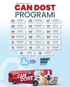 Can dostları önceleyen hizmetlerle Türkiye’ye örnek projeler üreten Balıkesir Büyükşehir Belediye Başkanı Ahmet Akın, sokaklardaki sahipsiz canların bakım ve tedavileri için Can Dost Mobil Hayvan Bakım ve Tedavi Aracını seferber ediyor. Ücretsiz bakım ve tedavinin yanı sıra; uzman veteriner hekimler tarafından sokaktaki canların parazit uygulaması, kuduz aşısı ve rutin kontrolleri yapılıyor. Aylık programlarla Balıkesir’in 20 ilçesini adım adım gezen mobil hayvan bakım ve tedavi aracının Ağustos-Eylül ayı programı belli oldu.