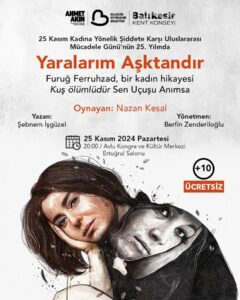 25 Kasım Kadına Yönelik Şiddetle Uluslararası Mücadele Günü’nde ünlü oyuncu Nazan Kesal, “Yaralarım Aşktandır” adlı tek kişilik oyunuyla 25 Kasım Pazartesi günü saat 20.00’de Avlu Kongre ve Kültür Merkezi’nde Balıkesirli sanatseverlerle buluşacak. “Kuş ölümlüdür, sen uçuşu anımsa” sözüyle hafızalarda yer edinen, İran’da kadınların yaşamlarının daha iyi hak ve koşullara kavuşması için mücadele veren Furuğ Ferruhzad’a hayat veren Nazan Kesal, tek kişilik oyunuyla kadının varoluş mücadelesini anlatacak.