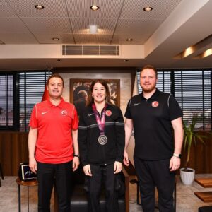 Slovakya’da düzenlenen 2025 Avrupa Güreş Şampiyonası’nda kadınlar 76 kiloda gümüş madalya kazanan Balıkesirli milli sporcu Yasemin Adar Yiğit yuvasına döndü. Balıkesir Büyükşehir Belediyespor Kulübü’nün olimpiyat sporcusu Yiğit, Balıkesir Büyükşehir Belediye Başkanı Ahmet Akın’ı makamında ziyaret etti. Balıkesir Güreş İl Temsilcisi olan eşi Erdem Yiğit’in de yer aldığı ziyarette Balıkesir’in gururu Yasemin Adar Yiğit, Başkan Akın’a ay yıldızlı tişört hediye etti. Genç sporcunun spora kattığı değerin önemine değinen Başkan Akın, “Balıkesir Büyükşehir Belediyespor’umuzun olimpiyat sporcusu, milli gururumuz, Yasemin Adar Yiğit ve Balıkesir Güreş İl Temsilcisi olan kıymetli eşi Erdem Yiğit ziyaretimize geldi. Yasemin kardeşime sporda ülkemize ve kentimize kattığı değerler için teşekkür ediyorum. Hediyesi Ay Yıldızlı tişörtü de hep saklayacağım.” dedi.