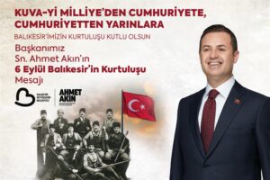 Balıkesir Büyükşehir Belediye Başkanı Ahmet Akın, 6 Eylül Balıkesir’in Kurtuluş Günü dolayısıyla bir mesaj yayımladı. Balıkesirliler için bağımsızlığımızın ve vatan sevdasının sarsılmaz simgesi olan 6 Eylül Balıkesir’in Kurtuluş Günü’nü gönülden kutladığını dile getirerek hemşehrilerinin bayram coşkusunu en kalbi duygularıyla paylaştığını vurgulayan Başkan Ahmet Akın, devamında şu ifadelere yer verdi: