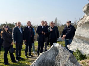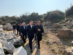 Antik dönemin en önemli birkaç yapısından biri olan Kyzikos Antik Kenti’nde kazı çalışmaları Kültür ve Turizm Bakanlığı ve Balıkesir Büyükşehir Belediyesinin iş birliğinde devam ediyor. Erdek’in Kapıdağ Yarımadası’nda bulunan antik kentteki kazı çalışmalarını yerinde inceleyen Balıkesir Büyükşehir Belediye Başkanı Ahmet Akın’a Erdek Belediye Başkanı Burhan Karışık, BBB Güney Marmara Koordinatörü Murat Karakoyun, BASKİ Genel Müdürü Erdoğan Öztürk, Kyzikos Antik Kenti Kazı Başkanı Ahmet Tercanlıoğlu ve Erdek Ticaret Odası Başkanı Hüseyin Uz eşlik etti. Kapıdağ Yarımadası’nda ilkleri barındıran deniz turizmi ve eşsiz doğasıyla öne çıkan bölgedeki tarihi zenginliği gün yüzüne çıkarmaya kararlılıkla devam ettiklerini söyleyen Başkan Akın, Balıkesir’i kültür turizminde de Türkiye’nin parlayan yıldızı haline getireceklerini dile getirdi.