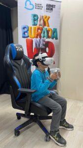 VR sanal gerçeklik gözlüğüyle keyifli oyunlar oynadıklarını belirten Azra Yıldırım, “Çok güzel bir histi, çok mutluydum. Dağlar vardı. Tren rayları vardı ve havaya kaldırıp beni aşağıya indiriyordu. Sağa sola gidiyordu. Çok güzel bir deneyimdi” ifadelerini kullandı.